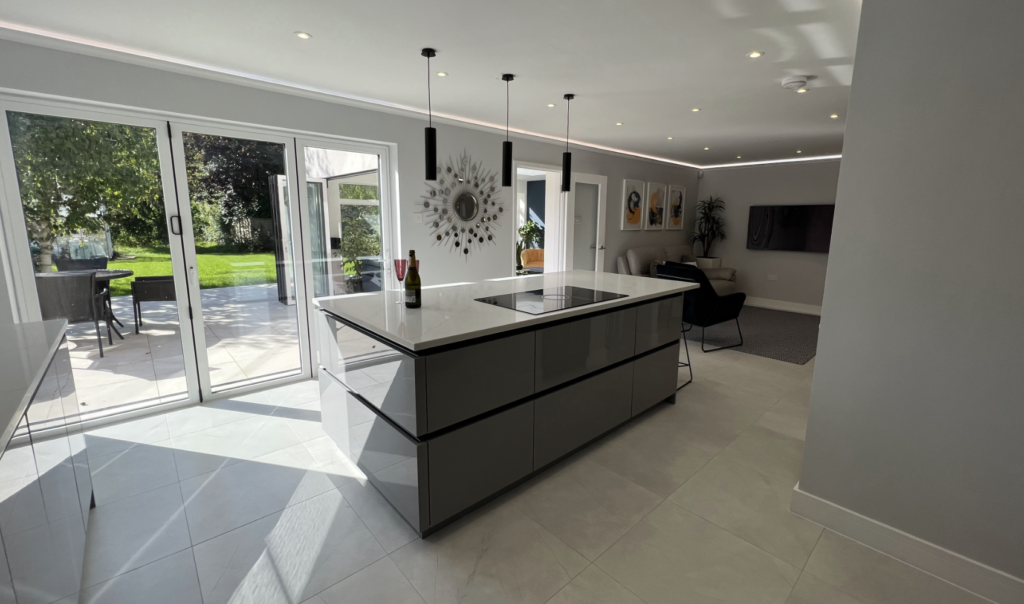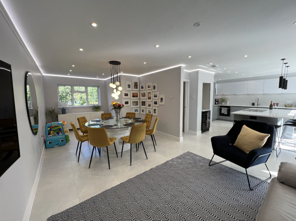 These re-modelled ground floor and rear extension, provided a new open plan kitchen and living space with a decent connection to the garden. The result is a transformation for easy and enjoyable use of the ground floor .